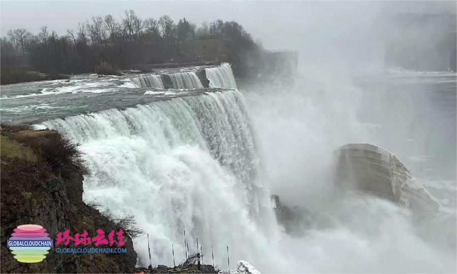 瀑布从尼亚加拉河上游跌落而下,激起千层浪,瀑布之下的河面冰雪尚未完全融化