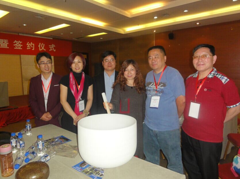 在下午的互动环节,参会企业家代表与国家对外文化贸易基地代表团队在参展的、能发出唯美、纯净、悠长的“水晶钵”前合影