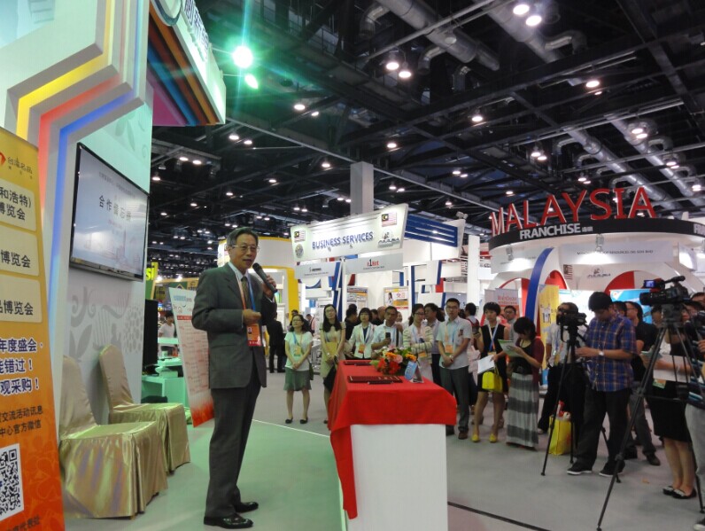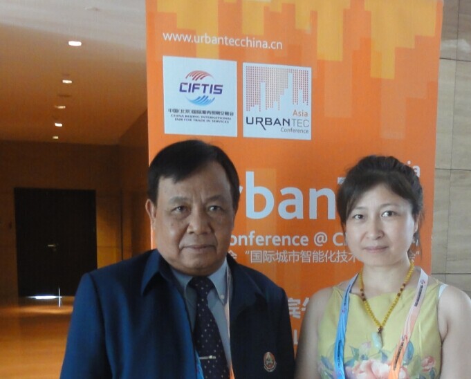 时任亚太城市网主编王晓玲与老挝国家商贸部部长在第三届京交会上合影